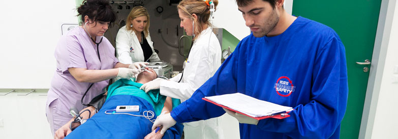 Bei Bedarf ist in der Druckkammer die kardiorespiratorische Hilfe mit einem mobilen Notfallwagen, ein für die Druckkammer geeignetes Beatmungsgerät und ein EKG-Monitor mit Verbindungen nach außen garantiert.